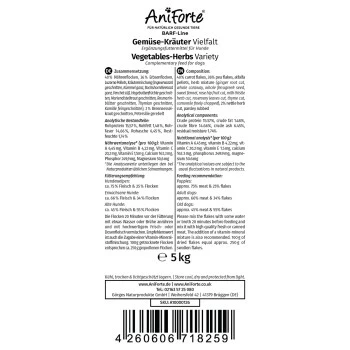 AniForte Gemüse-Kräuter Vielfalt ist eine schonend getrocknete Mischung aus heimischen Kräutern und Gemüseflocken für Hunde. Die getreidefreie Zusammensetzung stellt eine vitale, nährstoffdichte Ergänzung für Hunde dar – ideal zum Barfen oder auch zum Mischen mit Dosenfleisch.