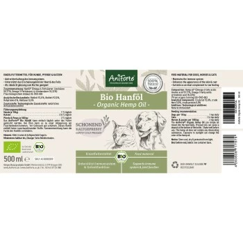 AniForte Bio Hanföl ist ein fettes Pflanzenöl, das aus den Samen des Nutzhanfs (Cannabis sativa) hergestellt wird. Daher enthält es auch keine berauschenden Stoffe, die das Nervensystem beeinträchtigen. Hanföl ist hoch bioverfügbar und weist einen hohen Gehalt an essentiellen Fettsäuren, wie z.B. Linolsäure (Omega-6) und α-(alpha-)Linolensäure (Omega-3) auf. Linolsäure ist an einer Vielzahl von biologischen Funktionen beteiligt und spielt eine wichtige Rolle beim Zellwachstum, Immunsystem und der Reproduktion. Zudem unterstützen essentielle Fettsäuren die normale Entwicklung der Haut. Die Verwendung von Hanfprodukten hat sich vor allem zur Erhaltung des Immunsystems und der Gelenkfunktion bei Tieren bewährt.