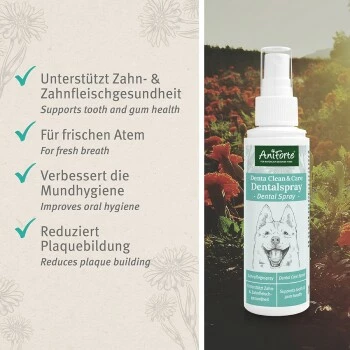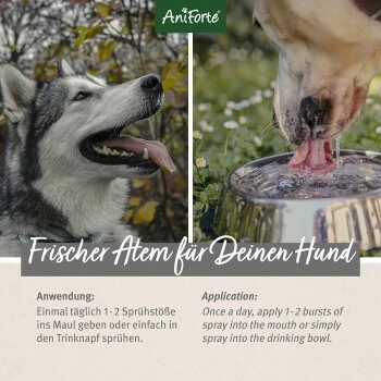 Da wir natürliche Inhaltsstoffe aus Pflanzenextrakten nutzen, eignet sich das Dentalspray für Hunde, die nicht alles vertragen. Das AniForte Denta Clean & Care Dentalspray ist die flüssige Zahnbürste für Hunde – noch nie war Mundhygiene einfacher! Einmal täglich 1 – 2 Sprühstöße ins Maul oder ins Trinkwasser geben.