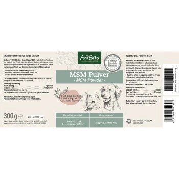 Methylsulfonylmethan ist ein natürlicher Stoff, der den Körper Deines Vierbeiners mit lebenswichtigem Schwefel versorgen kann. Das AniForte MSM Pulver besteht aus reinem Methylsulphonylmethan und eignet sich daher auch bei Futtermittelunverträglichkeiten oder Allergikern. Das MSM ist Bestandteil vieler körpereigener Stoffe wie Enzymen, Hormonen und Aminosäuren. AniForte MSM Pulver kann sich positiv auf die Haut, Fell, Bindegewebe, Stoffwechsel und auf die Gelenkkraft Deines Hundes auswirken.