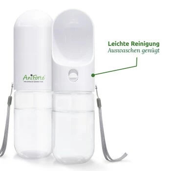 Die AniForte Trinkflasche für Hunde ist die Lösung für lange Spaziergänge mit Deinem Vierbeiner. Pfützenwasser und verunreinigte Bäche gehören als Wasserlieferant nun der Vergangenheit an. Mit unserer AniForte Trinkflasche bist Du perfekt gerüstet für kleine und große Gassirunden mit Deinem Liebling.