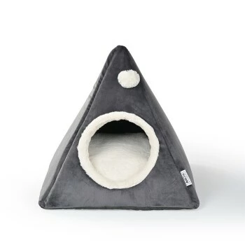 Durch die mit grauem Kurzhaar-Plüschstoff überzogene Außenseite und dem beigen Langhaarplüsch wirkt die Höhle edel und zeitlos. An der Höhlenspitze findet deine Fellnase einen kleinen Spielball der zum Spielen einlädt.