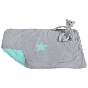 Die weiche Wendedecke in modernem Sternchendesign wird in zwei verschiedenen Farbkombinationen angeboten (Organge/Türkis), wobei sich hier auch das Spielzeug entsprechend ändert (Affe/Teddy). Das schlichte und einfache Design der Decke fügt sich optimal in jede Wohnumgebung ein und lässt sich universell zu Hause oder auch unterwegs einsetzen. Die Decke lässt sich bei 30° waschen und ist somit leicht zu reinigen, das Spielzeug hingegen sollte nicht in die Waschmaschine.