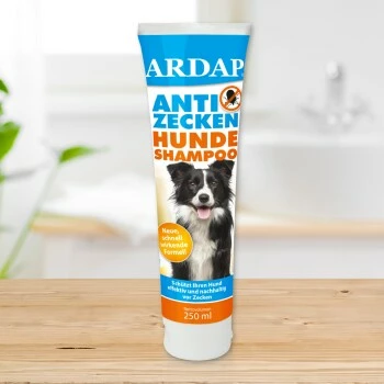 Benetzen Sie auf sanfte Weise das Fell Ihres Hundes mit lauwarmem Wasser. Verwenden Sie die nachstehend vorgeschlagene Menge Shampoo und massieren Sie es in das Fell ein. Achten Sie darauf, empfindliche Bereiche wie Augen, Mund und Ohren zu meiden. Lassen Sie das Shampoo vor allem im Bereich des Halses und des Rutenansatzes, wo Zecken sich gerne ansammeln, gut aufschäumen. Sorgfältig mit lauwarmem Wasser ausspülen und dann den Hund trocknen. Lassen Sie ihn nicht außer Haus, bevor er vollkommen trocken ist.