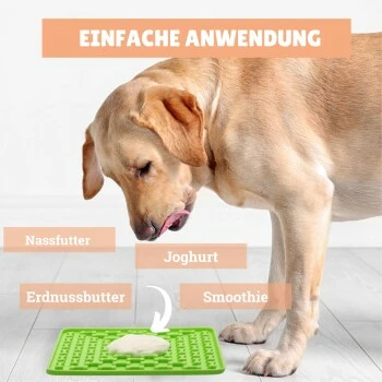 Weitere Anwendungsgebiete: Kann mit Joghurt, Quark, Nassfutter, Leberwurst, etc. befüllt werden. Kann auch eingefroren werden und eignet sich zur Abkühlung und Erfrischung im Sommer als Hundeeis-Schleckpad