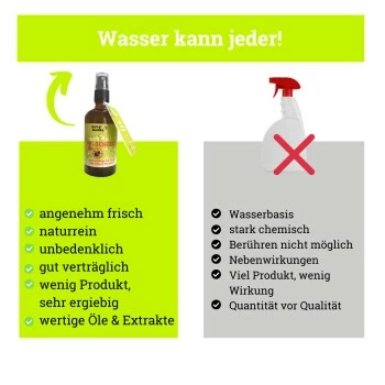Anwendung: Bitte vor Gebrauch schütteln. Danach auf die Handinnenflächen geben und auf dem Fell von Rücken, Beinen, Hals und Kopf verteilen (nur bei unverletzter Haut nutzen). Hat Dein Hund Angst vor Sprühgeräuschen, einfach in die Handfläche geben und im Fell verteilen.