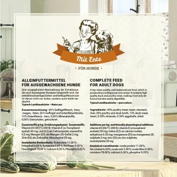Ente und Geflügel ist eine ausgeglichene, sehr schmackhafte Nassnahrung der Extraklasse, die nach hauseigener Rezeptur hergestellt wird. Sie enthält hochwertiges Enten- und Geflügelfleisch und ist darum nicht nur lecker, sondern auch leicht verdaulich.