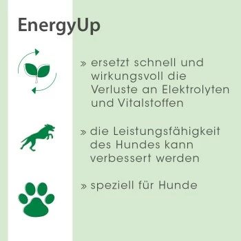 EnergyUp ersetzt schnell und wirkungsvoll die Verluste an Elektrolyten und Vitalstoffen, die während eines Wettkampfes, des Trainings oder einer Stresssituation entstehen. Durch den kurzfristigen Ausgleich dieser Verluste kann die Leistungsfähigkeit Ihres Hundes erhalten und verbessert werden. EnergyUp ist reich an Mineralstoffen, wie z.B. Magnesium, Folsäure, Phosphor und Kalium, und auch geschmacklich sehr attraktiv für Ihren Liebling.