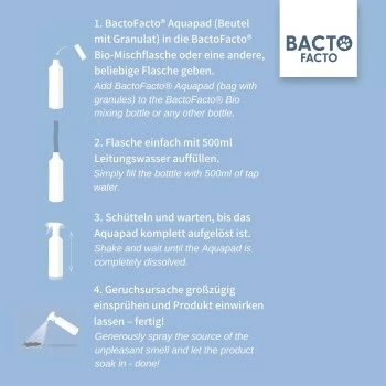 BactoFacto® Geruchsstopp ist ein hochmoderner probiotischer Geruchsvernichter und Reiniger zur Entfernung von Tiergerüchen aller Art. Entwickelt für die Haustierhaltung kommen mit BactoFacto® Geruchsstopp hochwirksame Mikroorganismen zur Wirkung. Die sogenannten BactoFacto®-Mikroben dringen tief in saugende und poröse Untergründe vor. Sie greifen sogar hartnäckigste Geruchsursachen wie Katzenurin, Erbrochenes oder Sekret an und sorgen so auf ganz natürliche und nachhaltige Weise und ohne Chemie für dauerhafte Frische und porentiefe Sauberkeit. Rückstandsfrei und biologisch abbaubar. Trotz seiner aggressiven Wirkung ist der BactoFacto® Geruchsstopp sanft und schonend zum Tier. Die Anwendung ist schnell und kinderleicht: