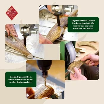 Das ChronoBalance Kaugeweih ist ein reines Naturprodukt und wird aus 100% abgeworfenem Damhirschgeweih gefertigt – für die Produktion werden keine Schlachttiere verwendet. Damhirsche werfen ihr Geweih einmal im Jahr auf natürliche Weise ab. Die aus dem Wald von Hand gesammelten Geweihstangen werden abgeschliffen und in die richtigen Größen zurechtgeschnitten, um einen hochwertigen Kauknochen für alle Art von Hunden zu garantieren.