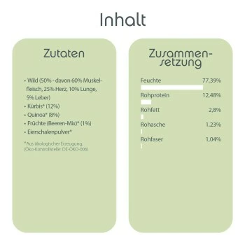 Inhalt: Das Hundefutter-Menü für den Abend enthält viel Muskelfleisch, Herz, Lunge und Leber vom Wild und hat daher einen hohen Fleischanteil. Auch die übrigen Zutaten in diesem natürlichen Hundefutter können sich sehen lassen: Der Kürbis im Futter enthält Kalium, das Eierschalenpulver des Nassfutters versorgt Ihren Hund mit Kalzium. Kalium und Kalzium sind essenziell für den Muskel- und den Knochenstoffwechsel des Hundes und stärken damit Muskeln und Knochen.