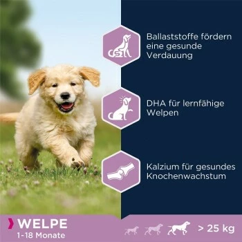 Die im Welpenfutter enthaltene Fettsäure DHA trägt entscheidend zur Entwicklung der Nervenbahnen des Gehirns bei und hilft dem Welpen seine kognitiven Fähigkeiten auszubilden. Außerdem enthält die Rezeptur Kalzium, welches das optimale Gelenk- und Knochenwachstum fördert. Die maßgeschneiderte Ballaststoffmischung aus Präbiotika und klinisch erprobten Rübenschnitzeln fördert eine gesunde Verdauung. Huhn dient als weitere Proteinquelle und unterstützt den Aufbau einer kräftigen, fettarmen Muskulatur. Zusätzlich ist in dem Eukanuba Trockenfutter L-Carnitin enthalten. Dieses unterstützt die Reduktion des Körperfetts. So hält Ihr Welpe ein optimales Gewicht und die Gelenkbelastung wird reduziert. Die einzigartigen, sechseckigen Eukanuba Kroketten und das DentaDefense-Zahnpflegesystem unterstützen langfristig saubere und gesunde Zähne. Die natürlichen Omega-6 und Omega-3-Quellen sorgen für gesunde Haut und glänzendes Fell. Außerdem helfen sie, den Haarausfall ihres Welpen zu reduzieren. Darüber hinaus stärkt Kurkuma, eine natürliche Quelle an Antioxidantien, das Immunsystem.