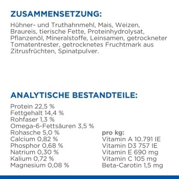- Versorgende Omega-6-Fettsäuren und Vitamin E fördern eine gesunde Haut und ein glänzendes Fell
