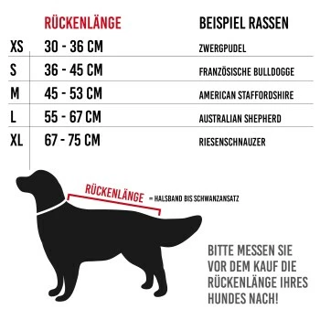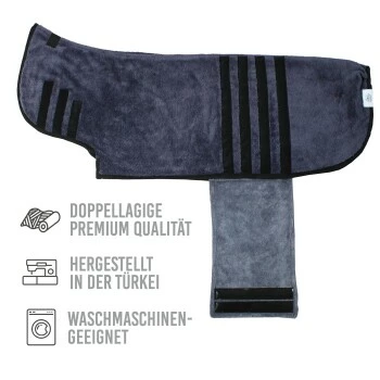 BITTE meßt vor dem Kauf die Rückenlänge ab (Halsband bis Schwanzansatz). In den Produktbildern findet ihr die empfohlenen Längenangaben unserer Hunde Bademäntel. Unsere Bademäntel fallen groß aus. So ist zum Beispiel Größe XS ungeeignet für Minihunde wie Chihuahuas. Der doppellagige Hundebademantel von KaraLuna wird unter höchsten Qualitätsstandards in der Türkei hergestellt. Unser Premium Hunde Bademantel ist maschinenwaschbar und trocknergeeignet. Der innenliegende Stoff besteht aus weicher und stark saugfähiger Mikrofaser, um das Hundefell schnell zu trocknen. Der äußere Stoff ist plüschiger und wärmender Velour. Der Hunde Bademantel lässt sich mit den praktischen Klettverschlüssen am Bauch und Hals individuell einstellen und ist dadurch für verschiedenste Hunderassen geeignet. Der flache Klett ist besonders fellfreundlich.