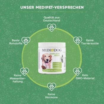 Der Darm hat einen großen Einfluss auf die allgemeine Gesundheit deines Hundes, insbesondere das Immunsystem, da die Darmoberfläche viele Nährstoffe aufnehmen kann. Mit Medidog Darm Aktiv Drops versorgst du dein Tier mit wichtigen Ballaststoffen, sowie pre- und probiotischen Komponenten.