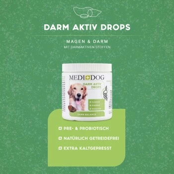 Medidog Darm Aktiv Drops liefern eine Vielzahl an Stoffen, welche Magen & Darm sanft unterstützen. Dein Hund braucht eine gesunde Darmflora für eine gute und geregelte Verdauung und optimale Nährstoffaufnahme.