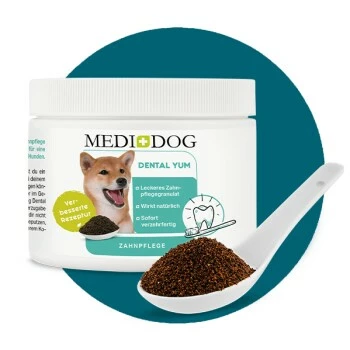 Medidog Dental YUM ist Kauspaß und Zahnpflege in einem. Das weiche Softgranulat sorgt für eine effektive und natürliche Zahnreinigung bei Hunden. Mit unserem Medidog Dental YUM erhältst du ein weiches Softgranulat das mit seinen Kauperlen bei deinem Hund für frischen Atem und weiße Zähne sorgen kann. Unser Dental YUM ist besonders lecker im Geschmack, dein Hund wird es lieben.