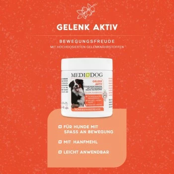 Wenn die Gelenke zwicken, bewegt sich dein Vierbeiner nicht mehr so gern – und wer rastet, der rostet. Schnell lässt dann die Mobilität deiner Fellnase nach, und der Bewegungsmangel führt zu stärkeren Gelenkschmerzen. Mit unseren natürlichen, exzellent verträglichen Medidog Gelenk Aktiv Tabletten für alle Hunde durchbrichst du diesen Teufelkreis!