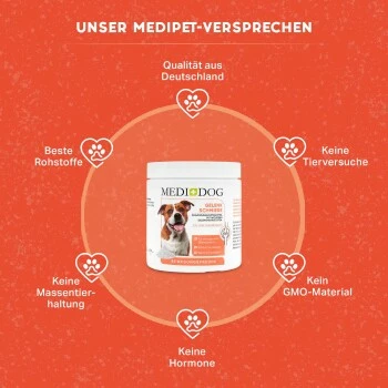 Die Medidog Gelenkschmiere enthält Kollagen-Hydrolysat, das deinen Vierbeiner mit Nährstoffen versorgt und einem ernährungsbedingten Mangel vorbeugen kann.