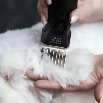 Beste Voraussetzungen für die Schur mit der Maschine: Fell auskämmen, grobe Verfilzungen mit einer passenden Tierhaarschneidemaschine und einem Feinzahnschneidsatz entfernen. Tier baden und sehr gut trocken föhnen. Dabei ausreichend Abstand halten und immer mit dem Haarwuchs bürsten und trocknen. Schneidsatz ölen.