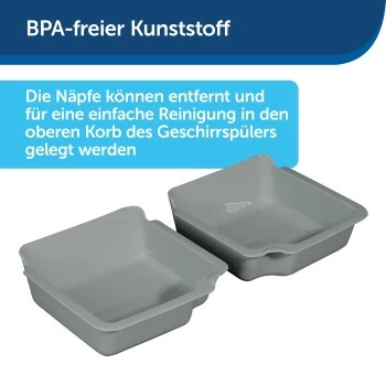 Dank des kompakten Designs können Sie den eleganten Futterautomaten überall in Ihrem Zuhause aufstellen. Die Schalen zum Reinigen einfach in den oberen Korb des Geschirrspülers legen.