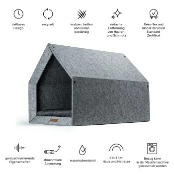 Die Oberflächen der verwendeten Materialien fühlen sich einfach angenehm an – für Tiere ist es genauso wichtig wie für Menschen. Letztendlich ist das ein Hundebett mit Dach, also ein Ort, an dem der Hund schläft und immer dann Ruhe findet, wenn es sie braucht. Der Oberstoff der Kissen ist samtweich – das wird Ihrem Liebling sicherlich gefallen!