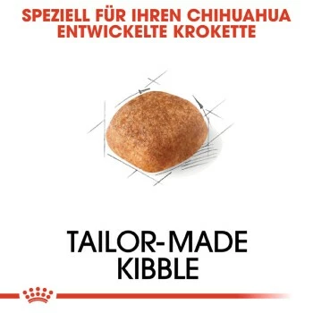 Form, Größe und Textur der Kroketten sind exklusiv für den winzigen Kiefer der Chihuahuas entwickelt worden. So kann ein Chihuahua die Kroketten leicht aufnehmen und ohne Schwierigkeiten kauen.
