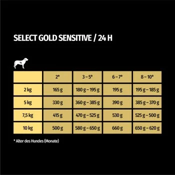 SELECT GOLD Sensitive Junior ist hochverträglich und optimal abgestimmt auf die Bedürfnisse heranwachsender Welpen und Junghunde nach dem Absetzen bis zum 24. Lebensmonat (je nach Hundegröße). Auch für tragende und säugende Hündinnen geeignet.