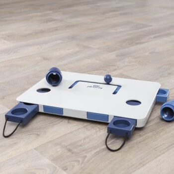 Hunde sind sehr intelligente und wissbegierige Tiere, welche nicht nur körperlich durch Spielen und Training, sondern auch geistig beschäftigt und herausgefrodert werden wollen. Durch den robust, aus Kunststoff gefertigten Dog Activity Move2Win von Trixie, können Sie Ihren Hund immer wieder von neuem fordern und durch das gemeinsame Spielen und Trainieren die Bindung zu Ihrem Liebling stärken. Das Brettspiel lässt sich gaz einfach mit kleinen Snacks oder Leckerlies befüllen, welche Ihren Hund zum Spielen annimieren. Durch Öffnen der Schubfächer, mit Hilfe der Schlaufen, bzw. durch Verschieben der jeweiligen Stempel, gelangt er an seine Belohnung. Nutzt man innerhalb des Spiels die Kegel als Stopper, lässt sich der Schwierigkeitsgrad steigern. Die inetgrierten Gummifüße machen das Brettspiel zudem äußerst standfest und verhindern somit ein Wegrutschen während des Spiels.