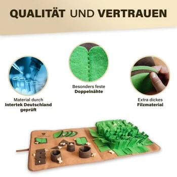 Um diesen natürlichen Schnüffeltrieb optimal zu unterstützen, haben wir einen hochwertigen Schnüffelteppich entwickelt. Artgerechte Nasenarbeit ist für Hunde nämlich nicht nur ein bisschen extra Vergnügen sondern fördert ganz gezielt die Konzentrationsfähigkeit und Ausgeglichenheit deines Vierbeiners.